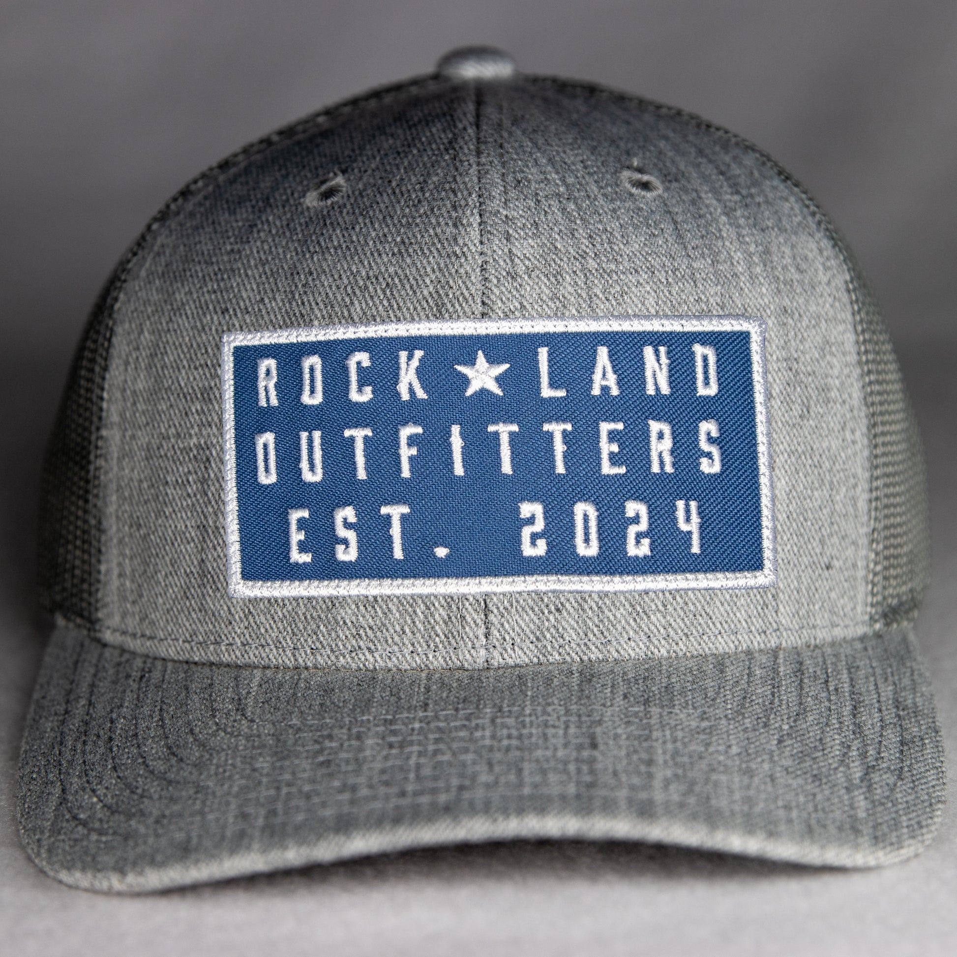 Rock Land Outfitters Blue Logo Patch On A Heather Gray Trucker Hat