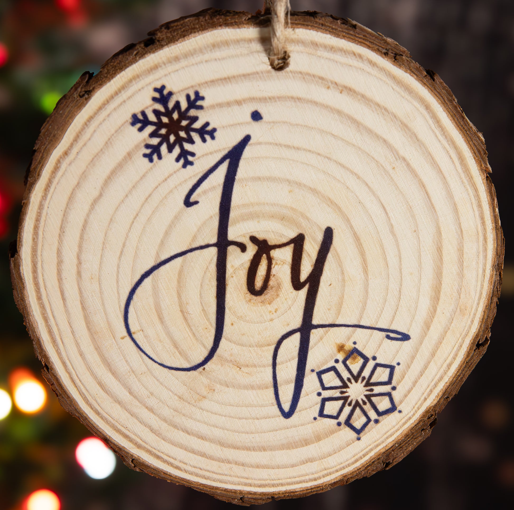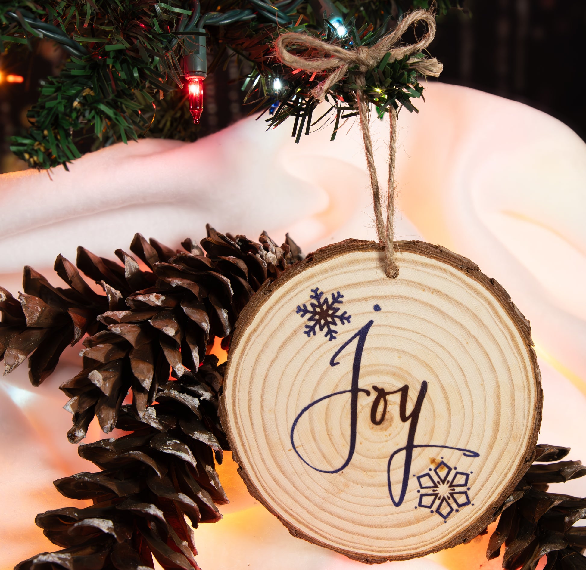 Each ornament is crafted from natural wood slices, so every piece is unique in shape and grain. Sizes range from approximately 3½" to 4" in diameter. A drilled hole and twine bow make it ready to hang from your tree, a wall hook, or anywhere you could use a little extra cheer.