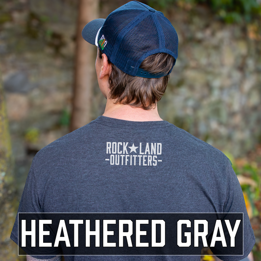 Heathered Gray Rock Land Outfitters Logo On A SoftStyle, Short Sleeve T-Shirt